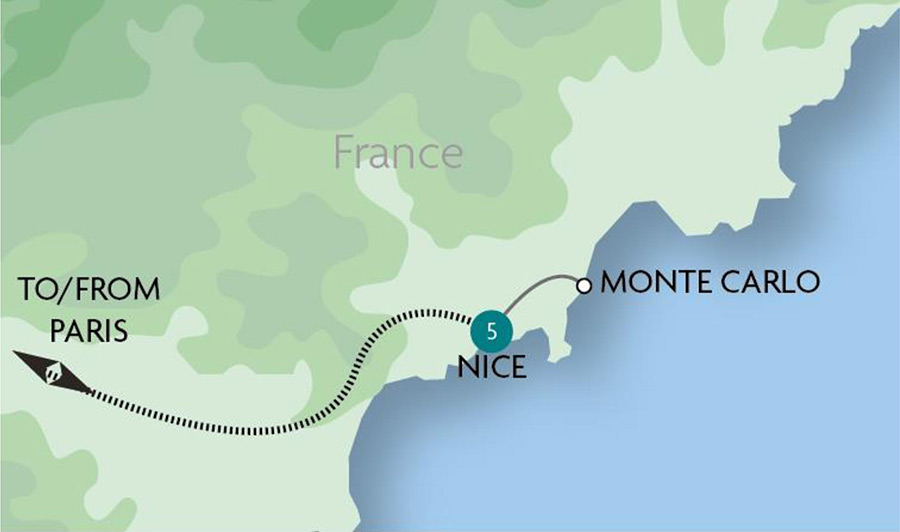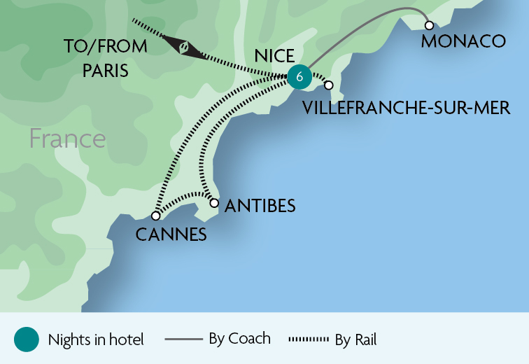 Explore the French Riviera from a hotel just a short walk from Nice's palm-lined Promenade des Anglais and its long beaches. Visit beautiful seaside towns with time to explore at your own pace. Discover colourful Villefrance-sur-Mer, uncover the history of the old port of Antibes, and savour the charm of Cannes. During a guided tour of Monaco,...