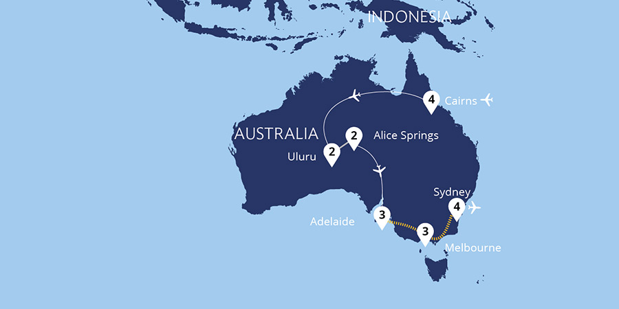 Join us on an epic adventure into this vast, vibrant and varied land to experience Australia's stunning natural wonders, from the rainforests of tropical Cairns and kaleidoscopic hues of the Great Barrier Reef to the burnished red tones of the ancient sacred site of Uluru. Explore Adelaide and its acclaimed wine region, discover the sights of...