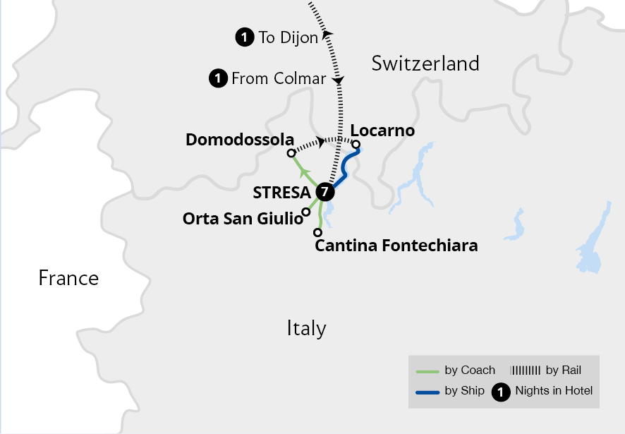 Explore the serene beauty of Italy's lakes from a base in the attractive town of Stresa, a haven for artists and writers over the centuries nestled on the shore of Lake Maggiore. Enjoy a cruise to an island monastery on Lake Orta and explore the lakeside village of Orta San Giulio. Journey through the Alps to Switzerland on the Centovalli...